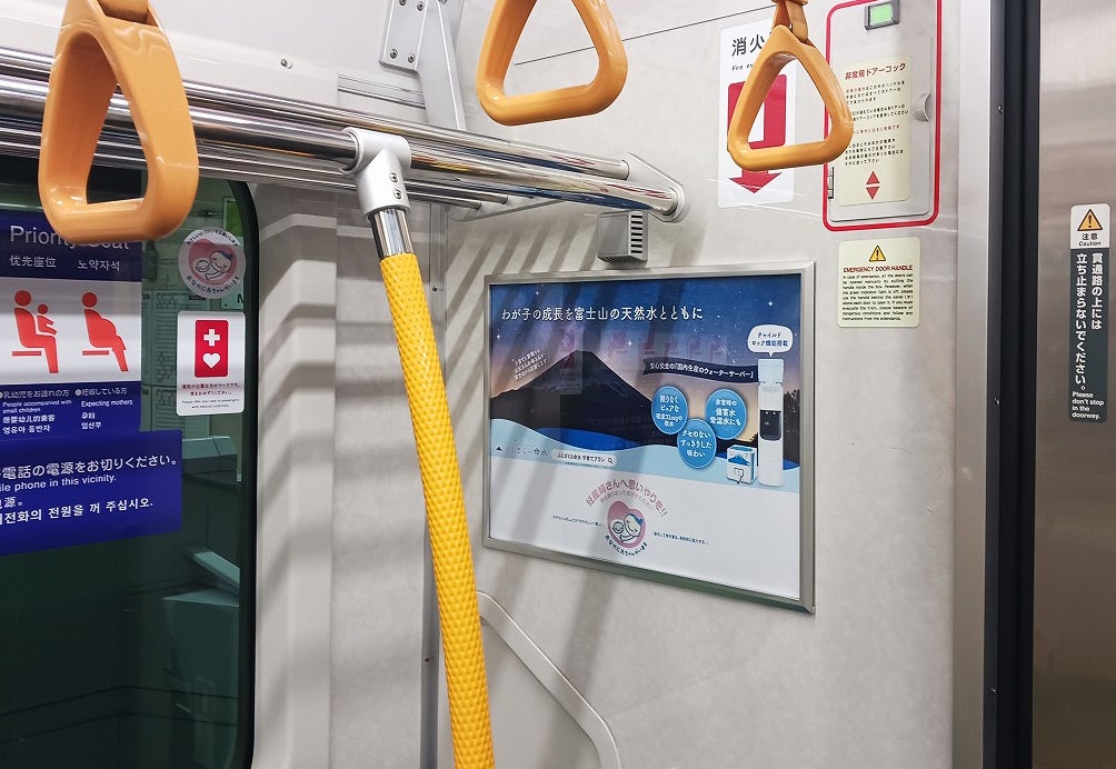 富士山の天然水ウォーターサーバー「ふじざくら命水」、マタニティマークとのタイアップ広告を優先席エリアに掲出開始【都営新宿線】