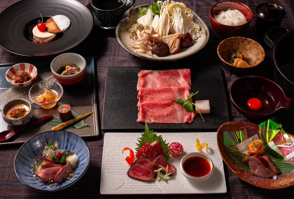 すきやき、しゃぶしゃぶ、ステーキから選べる贅沢なメインはもちろん、前菜やお造りの希少部位に至るまで米沢牛づくし。そしてデザートに、150周年のさくらんぼを使った「ジャムのムース」とだだちゃ豆サブレをご用意しております。