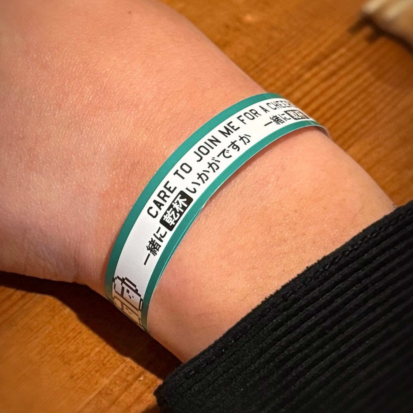 「静かにお酒を楽しみたい」「お店や常連さんに話しかけてみたい」「いろんなひとと乾杯したい」…など、今夜の飲みベ(=飲みのモチベーション)を手首につけて飲み歩き。日英表記、計6種を用意。