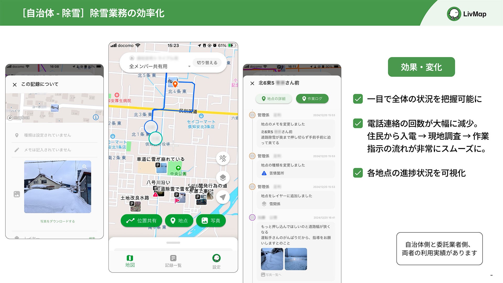 すでにLivMapが活用されている除雪作業などにおいても、互いの位置関係がより把握しやすくなります。