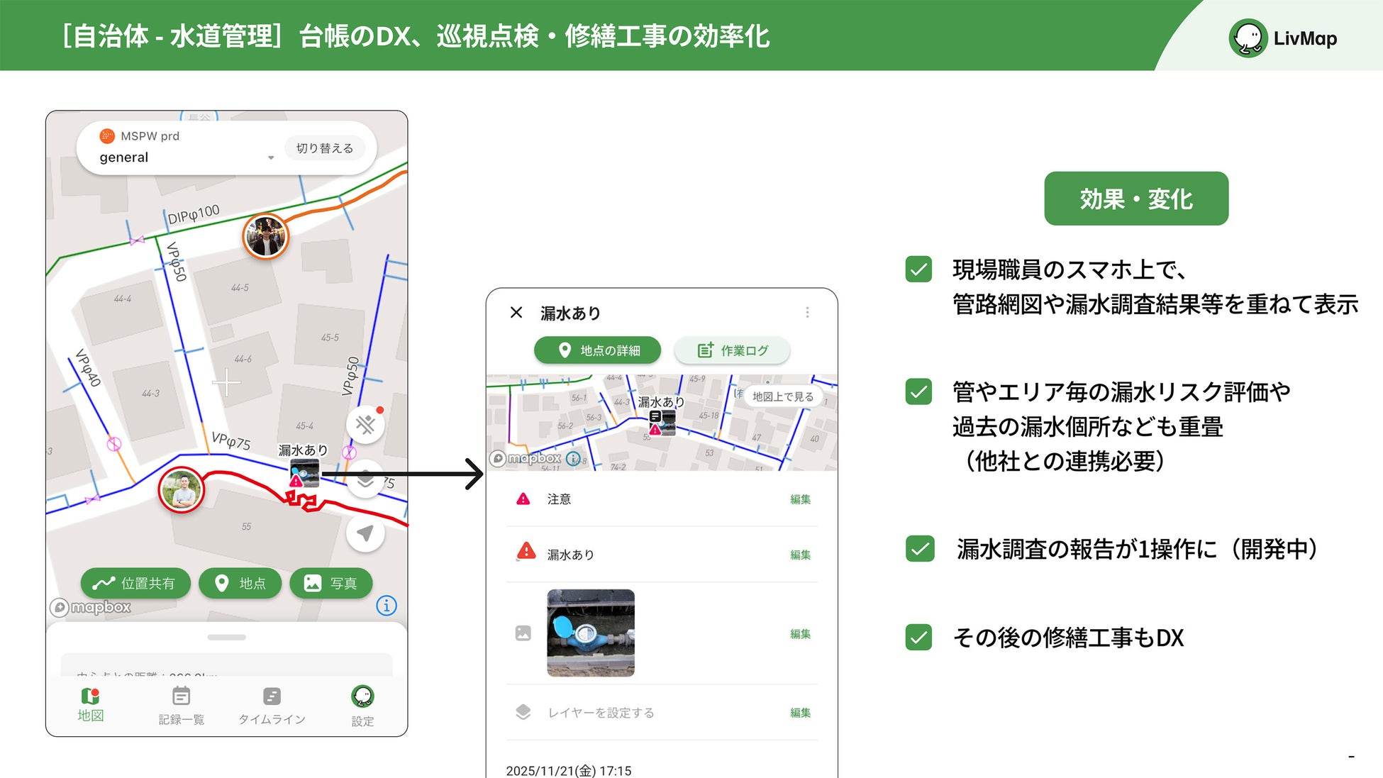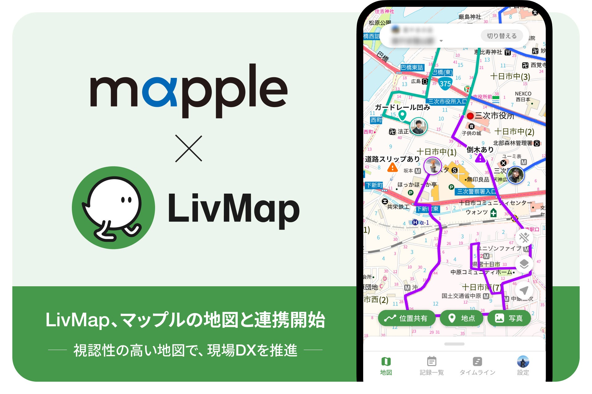 マップルの地図の優れた視認性により、LivMap上での情報共有がよりスムーズになり、現場作業のスピード向上に貢献します。