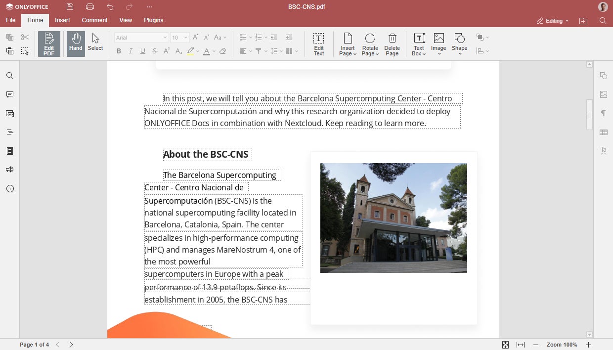 これを念頭に置いて、ONLYOFFICEチームはネイティブPDFエディターのアップグレードバージョンを提供します。このエディターは、テキストの編集、ページの操作(追加、回転、削除)、およびテーブル、図形、画像などのさまざまなオブジェクトの挿入をサポートしています。モードを切り替えることで、ユーザーはPDFファイルを編集するか、表示および注釈を付けることができます。