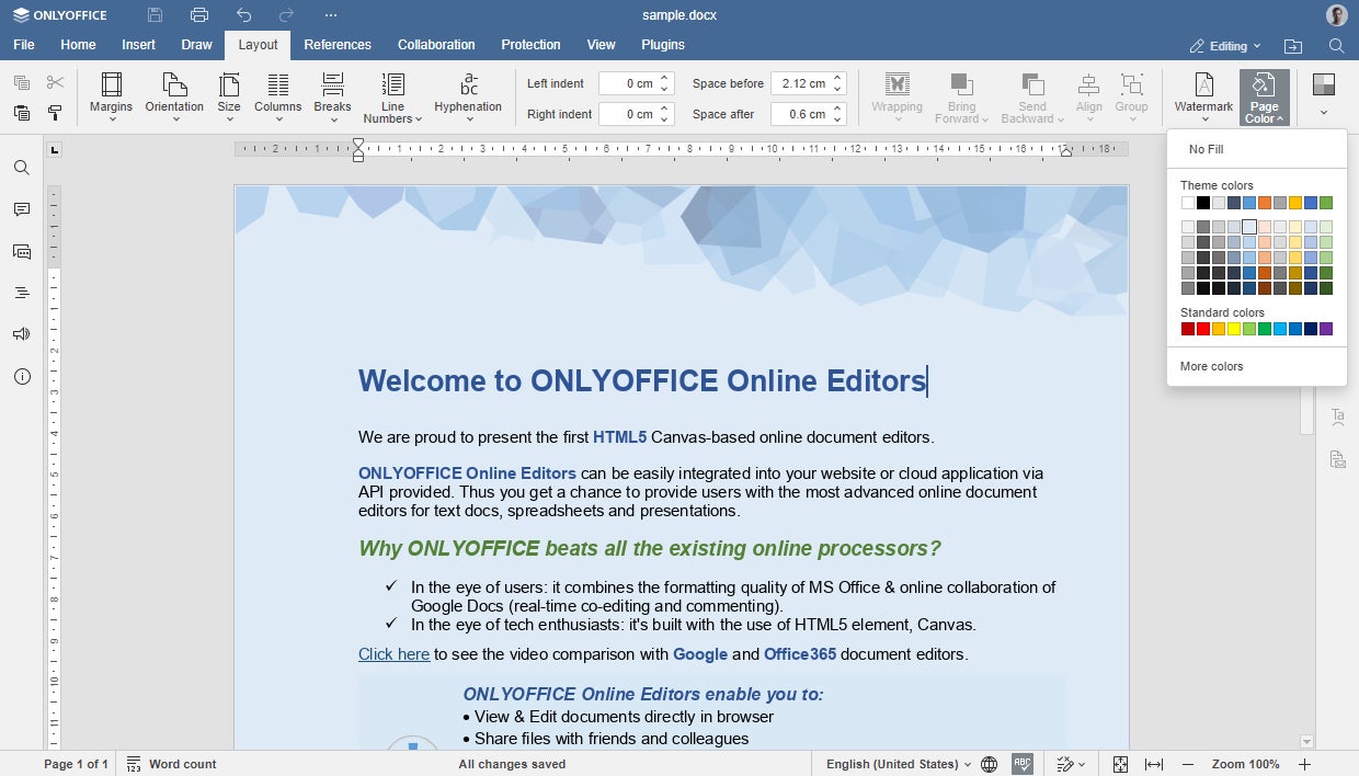 GDPR準拠のオフィススイートは、テキストドキュメント、スプレッドシート、およびプレゼンテーションのためのWebベースのエディターに加え、フォームクリエーター、PDFビューアーおよびコンバーターを含んでいます。ONLYOFFICE DocsはOOXMLファイルと完全に互換性があります。数百の書式設定およびスタイリングツールと複数の共同作業機能をユーザーに提供します。エディターにはリアルタイムおよび段落ロックの共同編集モード、コメントおよびレビュー、組み込みチャット、バージョン履歴が装備されています。