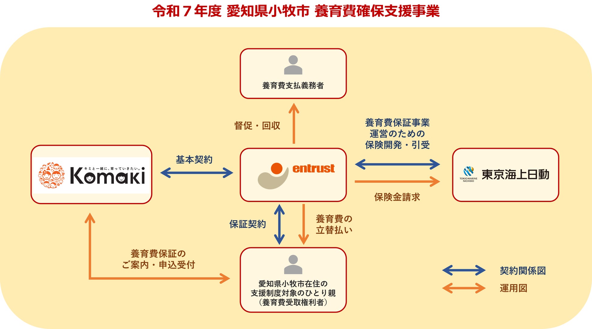 今回愛知県小牧市にご利用いただく『養育費保証』は、愛知県小牧市にお住まいのひとり親世帯と当社が個別に保証契約を締結する、地方自治体に向けた商品スキームです。初年度にかかる保証料の負担、および制度対象者へのご案内・申込受付は、愛知県小牧市にて実施します。
