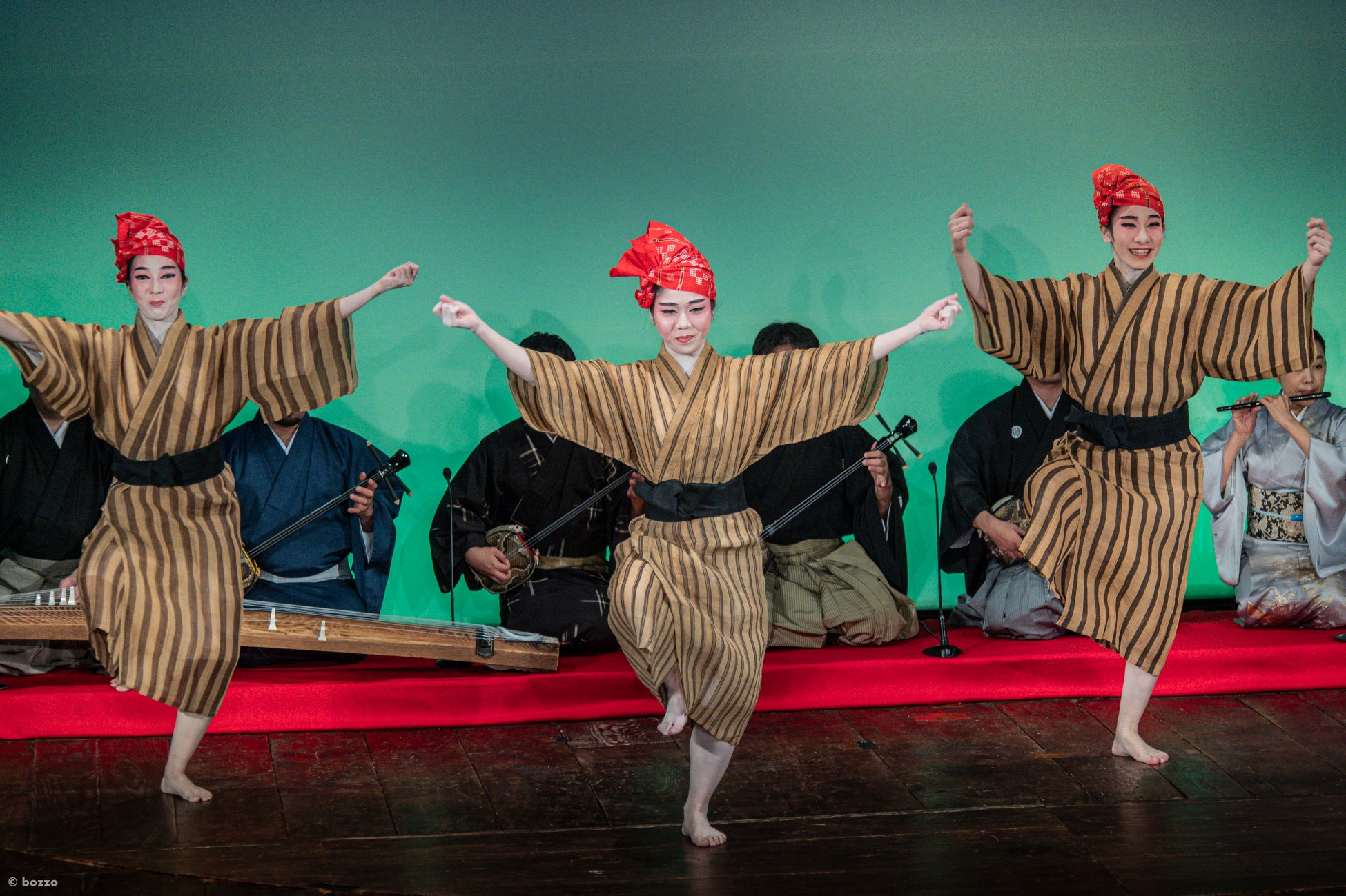 琉球王朝時代、首里城で国賓をもてなすために育まれた宮廷芸能。武力ではなく歌と踊りで心をひらく“平和外交”の歴史を起点に、古典舞踊から幕を開けました。続く明治期以降のパートでは、芸能が村々へひらかれ、大衆文化として息づいていった雑踊や沖縄民謡を紹介しました。