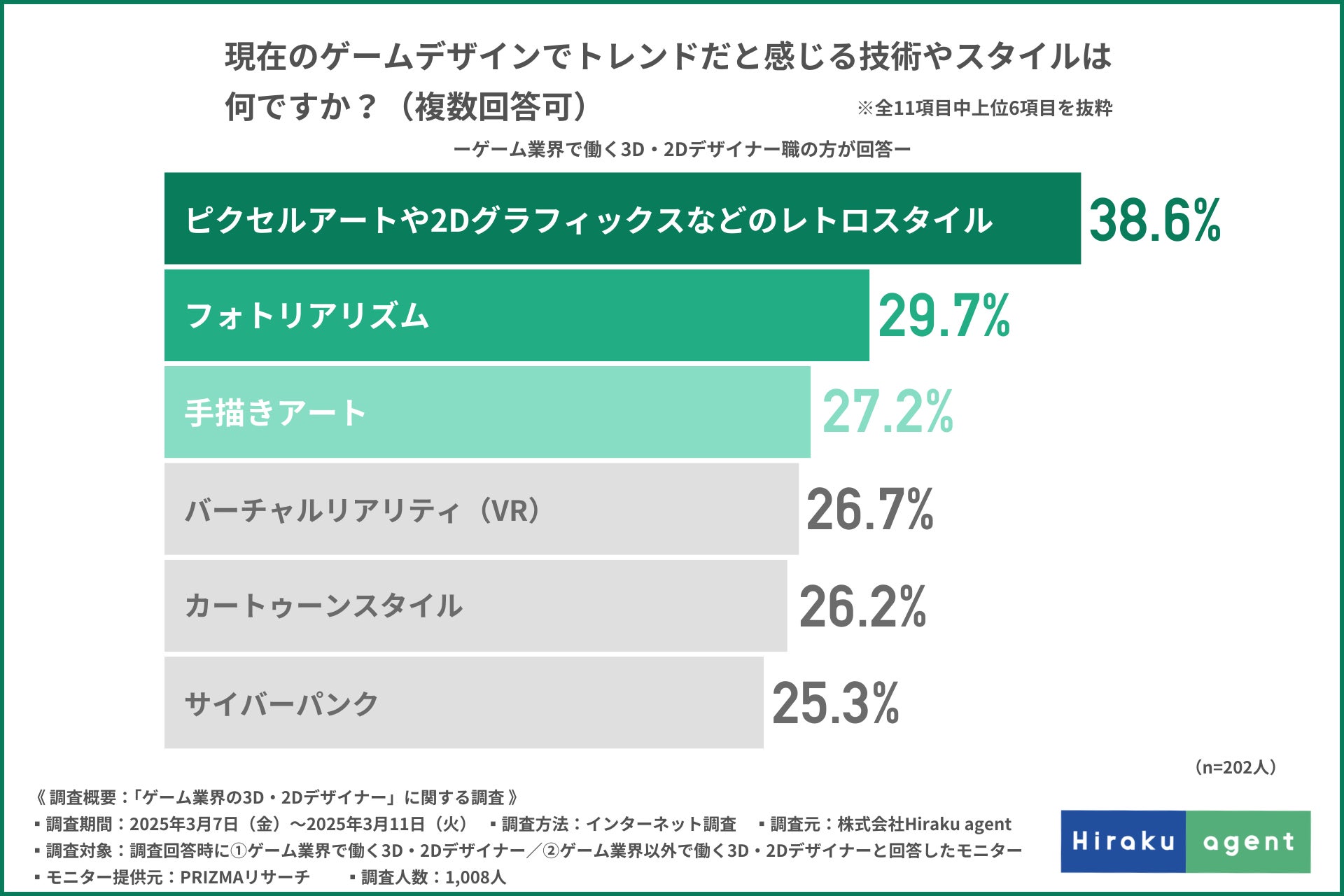 「現在のゲームデザインでトレンドだと感じる技術やスタイルは何ですか?(複数回答可)」と質問したところ、『ピクセルアートや2Dグラフィックスなどのレトロスタイル(38.6%)』と回答した方が最も多く、『フォトリアリズム(29.7%)』『手描きアート(27.2%)』と続きました。