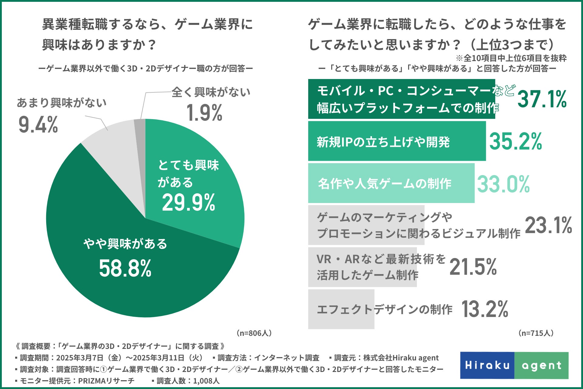 株式会社Hiraku agent(所在地:東京都品川区、代表取締役:加藤 啓介)は、①ゲーム業界で働く3D・2Dデザイナーの方/②ゲーム業界以外で働く3D・2Dデザイナーの方を対象に「ゲーム業界の3D・2Dデザイナー」に関する調査を行いました。