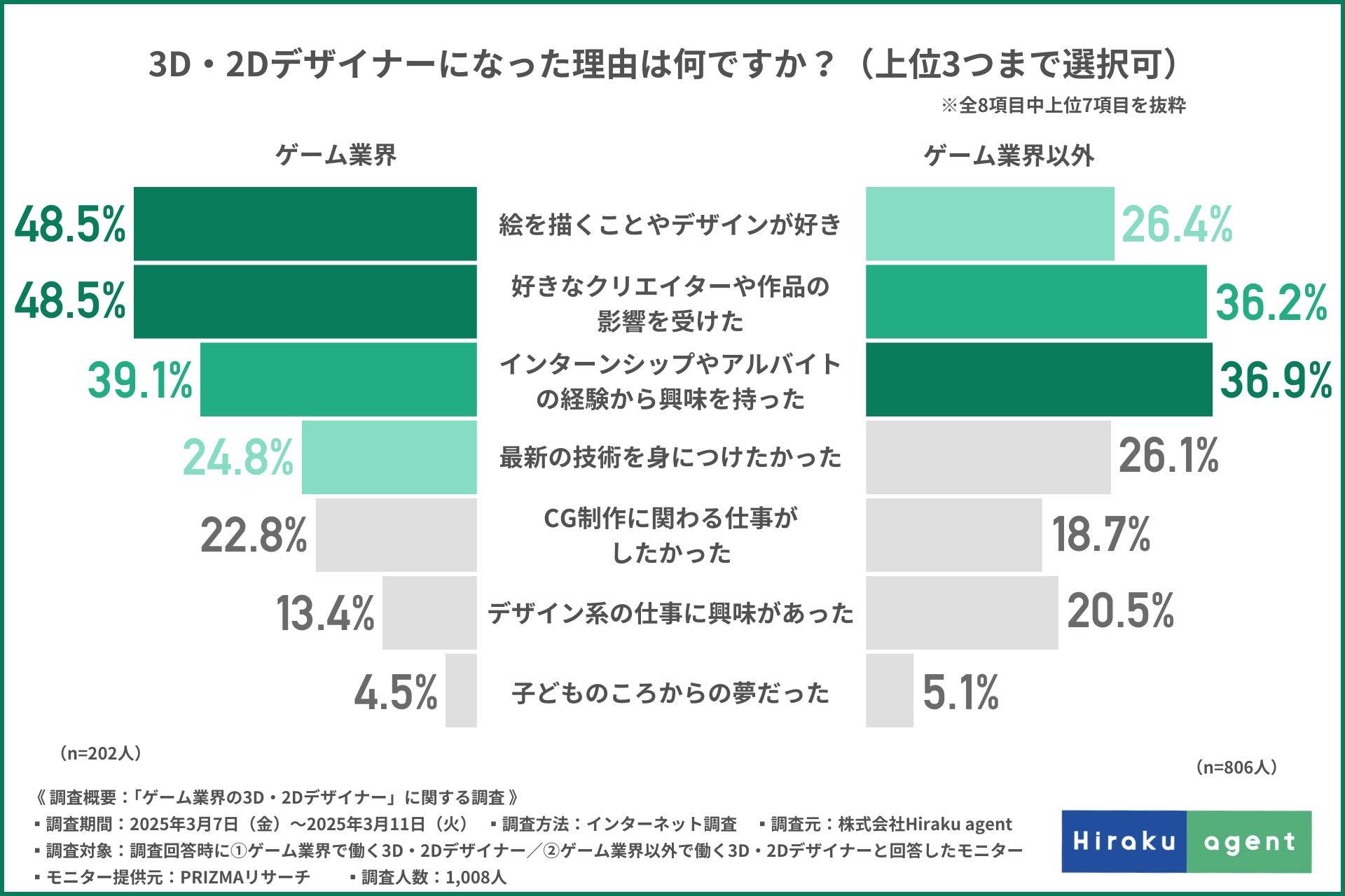 両者とも、憧れのクリエイターや作品からの影響が大きな要因となっていますが、ゲーム業界ではより強く、デザイナーとしてのキャリアを選択する際の重要な動機となっていることがうかがえます。