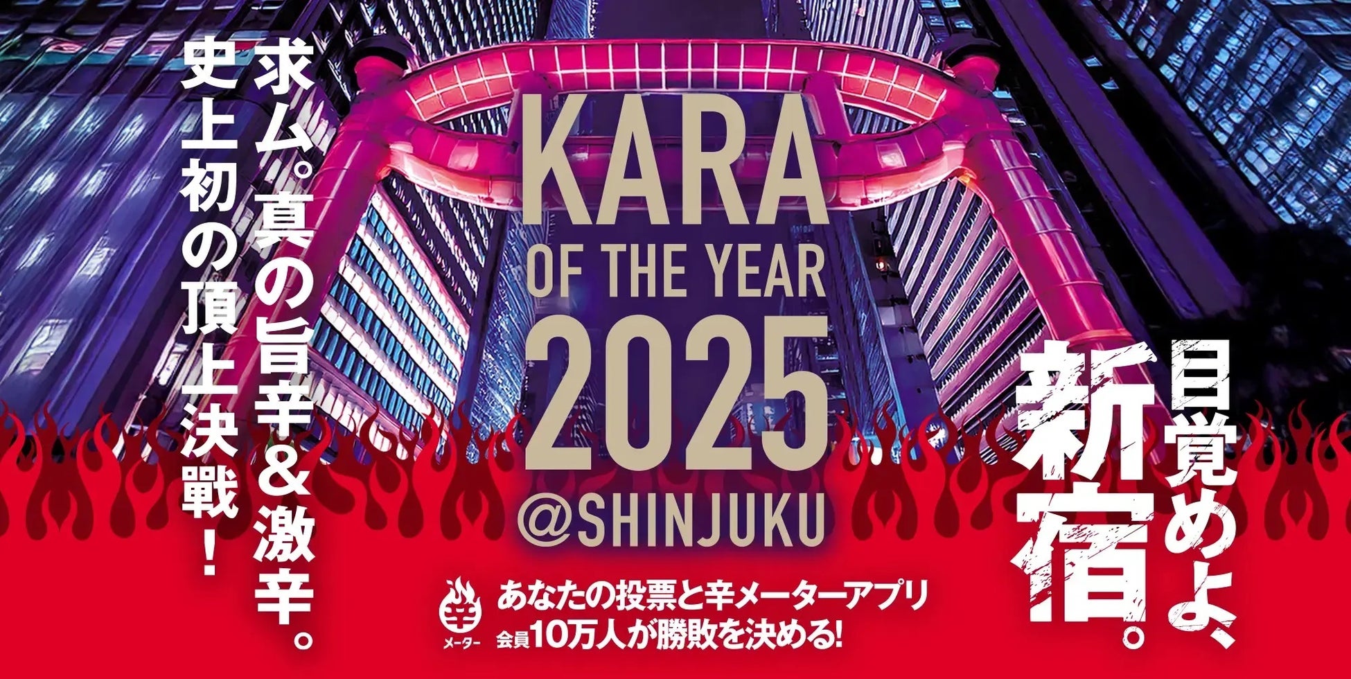 自分にピッタリの辛さに出会えるアプリ『辛メーター(辛メーター株式会社/代表:江口カン)』では、日本国内の旨辛および激辛メニューの美味しさや楽しさを広く社会に発信し、市場の活性化と業界の発展を目的に「辛・オブ・ザ・イヤー2025 / KARA OF THE YEAR 2025」を開催します。今回は旨辛・激辛の激戦地、新宿を舞台に旨辛・激辛NO.1を決定すべくネット投票によるコンテスト方式で実施。ただ辛いだけではなく、あくまで旨さと辛さのバランスが優れた料理コンテストとして広く飲食店の参加を募ります。(締切:3月15日)