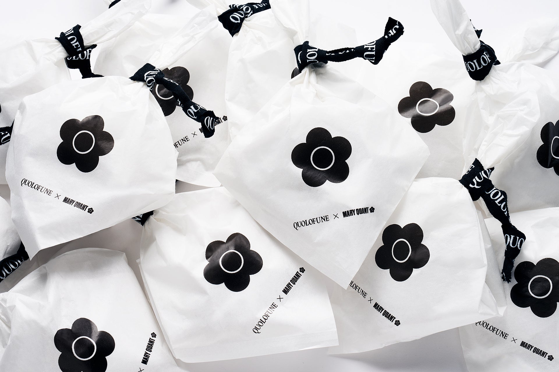 パッケージは「お菓子を丁寧にお包みする」という点にこだわり、ひとつひとつ人の手で包装しています。コラボレーション企画ではどら皮に「MARY QUANT」を象徴するブランドのアイコンであるデイジーの焼印を施し、モノトーンの特別パッケージでお包みしました。