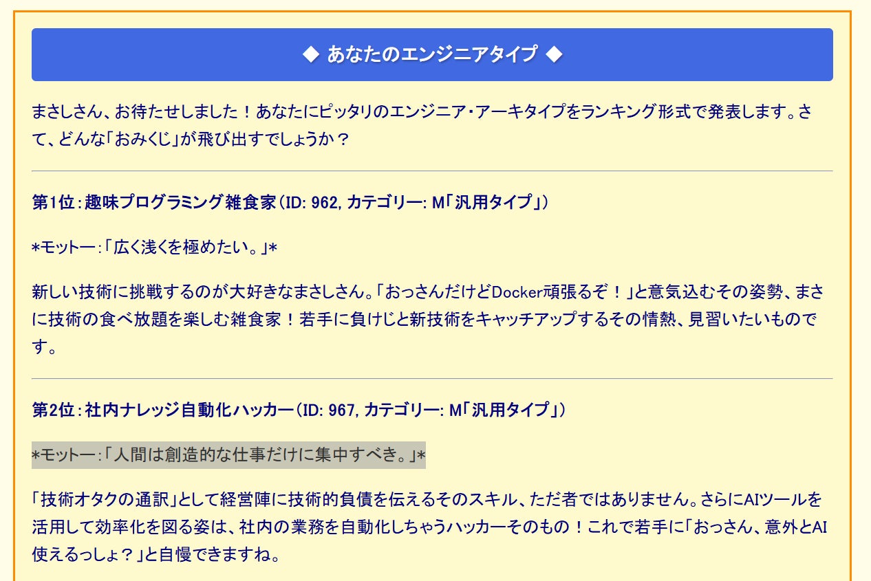 わずか数問の質問に答えるだけで、AIがあなたのエンジニアタイプを“おみくじ”スタイルで占います。何が出るかはお楽しみ。ぜひお気軽に体験してみてください。