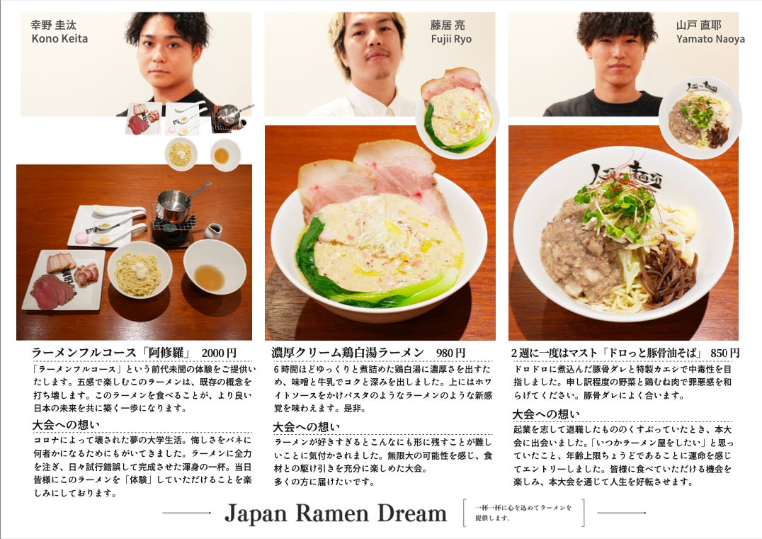 • 大会目的: 「Japan Ramen Dream」は、日本で新しい起業家の才能を発掘し育成するプロジェクトです。ラーメンを通じて夢を追いかける若者たちが、自身のオリジナリティを披露し、ラーメン業界の未来を創造します。