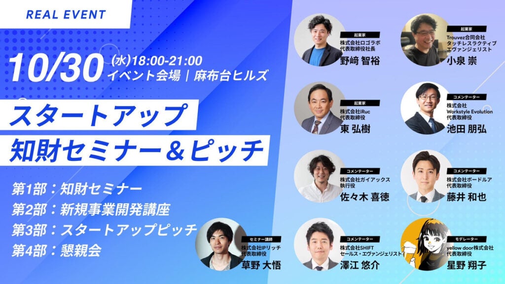 国内初 ※1 ブランド許諾管理SaaS「ロゴラボ」を提供する株式会社ロゴラボ(東京都中央区、代表取締役社長:野﨑 智裕、以下 当社)は、2024年10月30日(水)に株式会社IPリッチおよび株式会社SHIFTが主催する「スタートアップ知財セミナー&ピッチ」に、ロゴラボ 代表取締役社長 野﨑 智裕が登壇することをお知らせいたします。