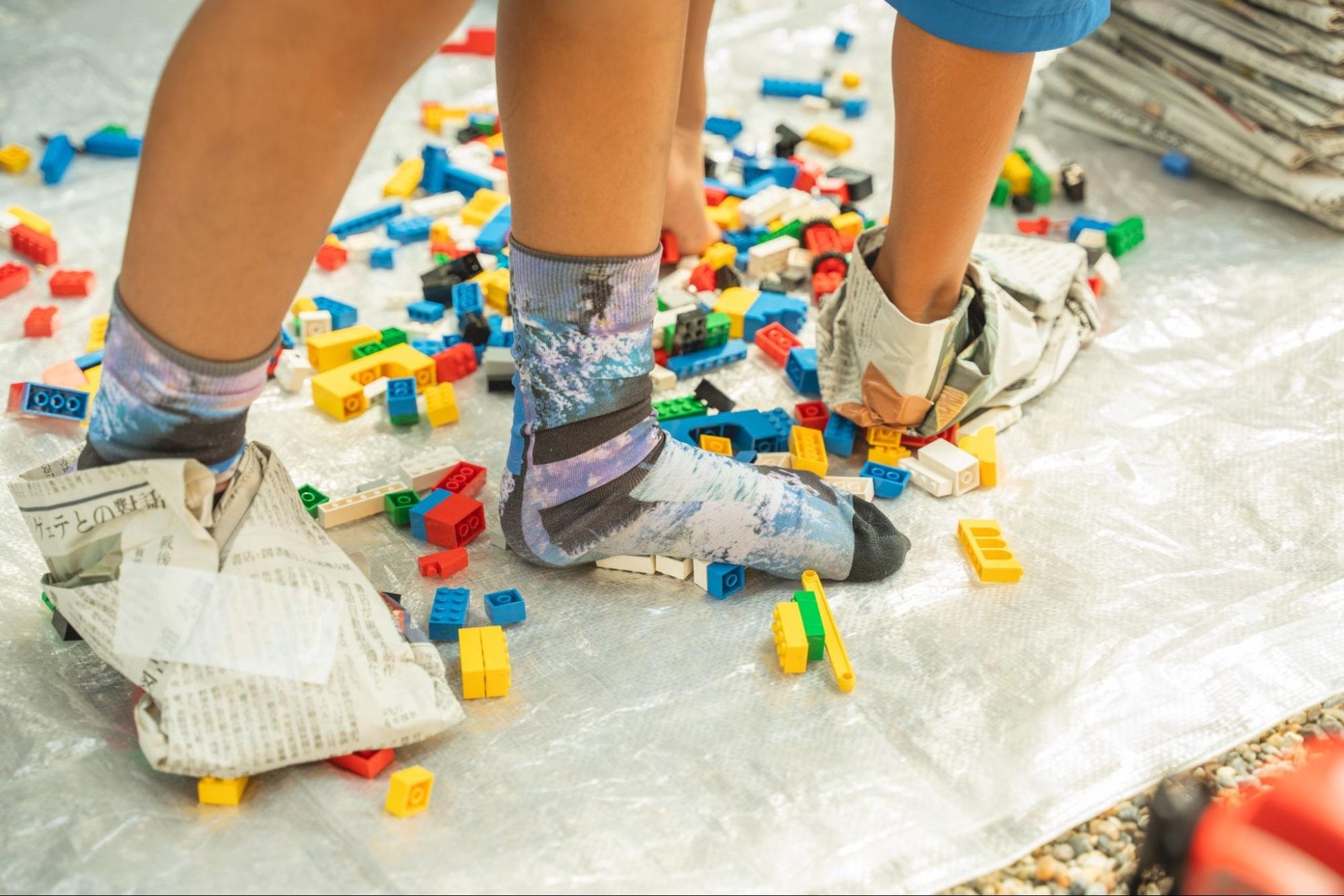 「地の修行 新聞紙で作る足袋とリュックで水運び!」では、身近な材料の新聞紙を使った道具をつくります。講師は本イベントの防災専門アドバイザーを務めた、災害医療や防災のプロフェッショナルの辻直美先生。地面に散らばったブロックを踏んでみて、新聞紙の足袋の効果を実感することができました。