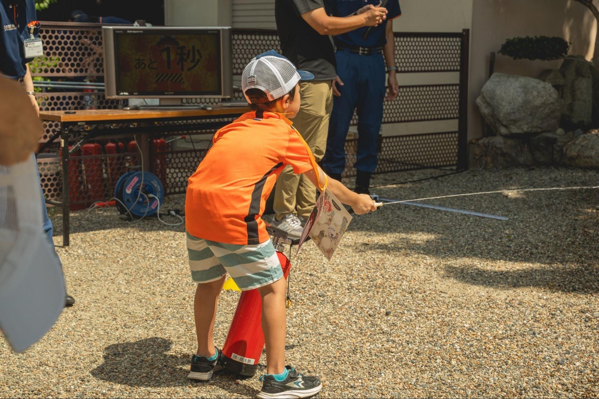「修行ラリー」はスタンプラリー型のワークショップで、子どもたちは火・水・風・地・恵・心とそれぞれ銘打たれた防災に役立つ修行を体験しました。「火の修行 鬼たいじ!消火器ストラックアウト!」は、消化器を使って的を当てるゲーム。消化器の使い方は、消防局の方から実際に教わります。