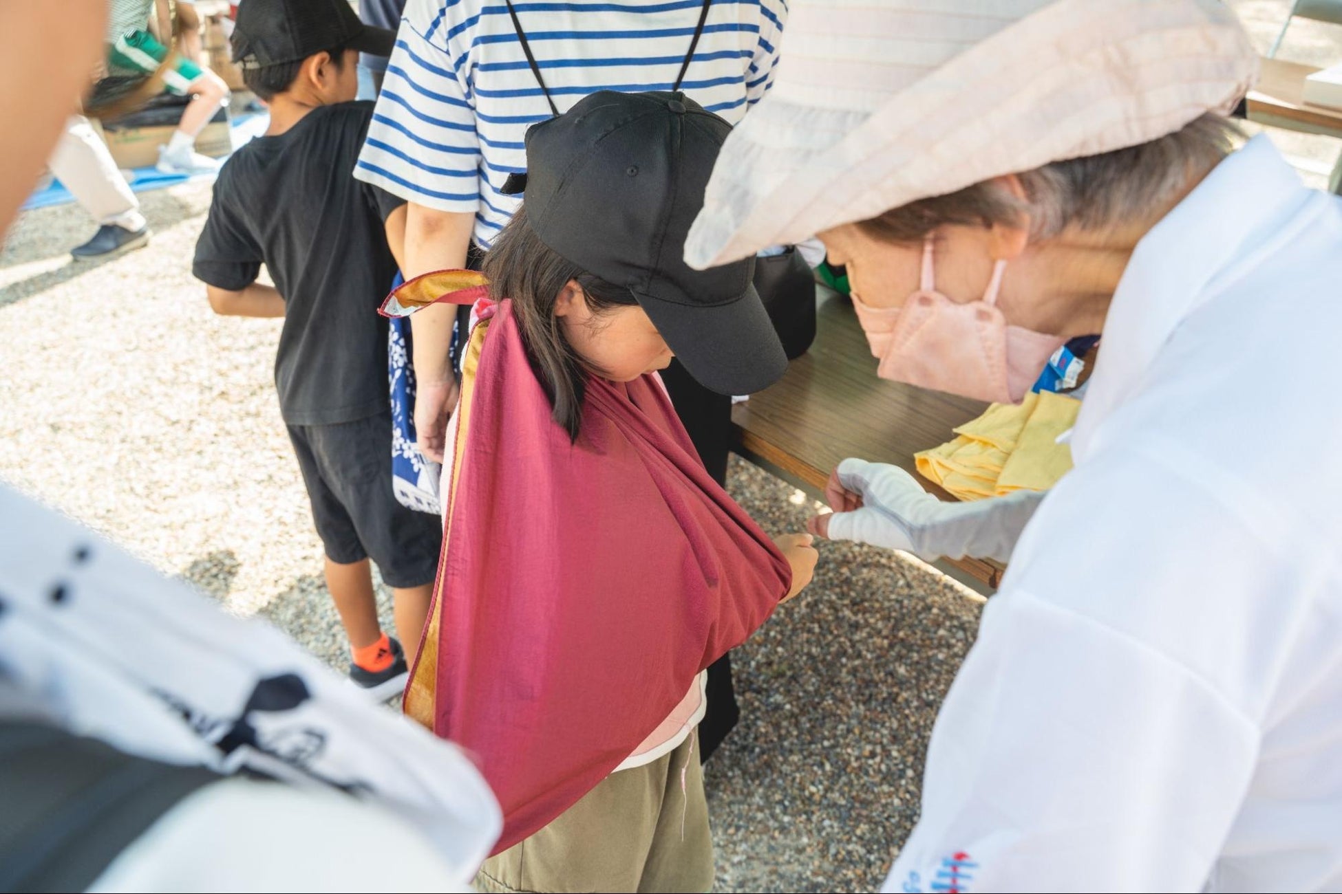 「水の修行 アイデアを形に!ふろしきワークショップ!」では、有事の際に、ふろしきをうまく活用して自分や周りの人たちを守る方法を学びます。折り紙のように示された手順のボードを参考にしながら、防災頭巾や、三角巾、荷物をたくさん包んだり、カッパにもなるボレロを作ることができるようになりました。