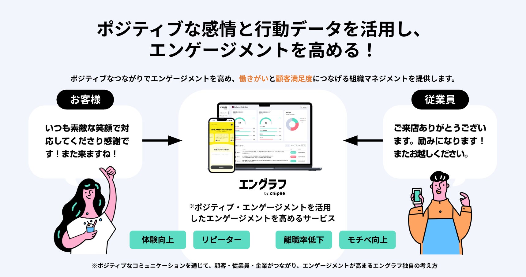 「こころとこころをつなぎ、世界を思いやりで満たす」をパーパスに掲げ、ウェルビーイング経営の実現を支援する株式会社チッピー(代表取締役:山崎令二郎)は、顧客のポジティブな感情と行動データを活用し、つながりを生むことで、顧客と従業員のエンゲージメント向上を支援するサービス「エングラフ」を提供しています。