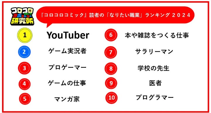 1977年の創刊以来続けている読者アンケートのデータをもとに、男子小学生のリアルを定期レポートおよび分析する新プロジェクト『コロコロコミック研究所(ラボラトリー)』を2024年7月から発足しています。その中で、読者の夢ともいえる、「なりたい職業」を調査しました。なりたい職業ランキングの1位は「YouTuber」 18年から24年までの7年間で6回トップを獲得しており、動画撮影から発信することにまで興味が広がっています。67万人の登録者を抱えるYouTubeチャンネルである『コロコロチャンネル』( https://www.youtube.com/c/corocoro )の発信を通じても読者の夢が広がる、わくわくを刺激する、そんなコンテンツを増やしていきたいと考えています。