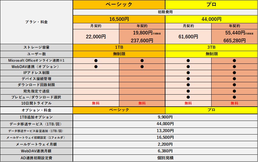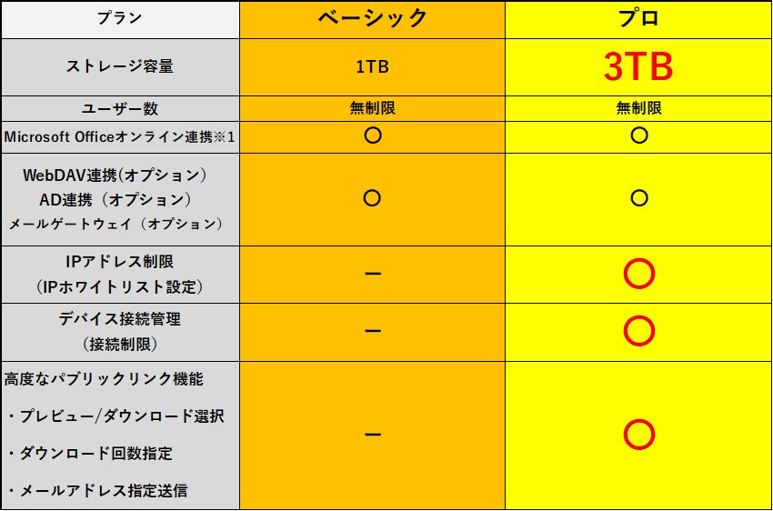 『ベーシックプラン』(ストレージ容量1TB)と『プロプラン』(ストレージ容量3TB+セキュリティ・管理機能強化)の2つのプランから選べます。