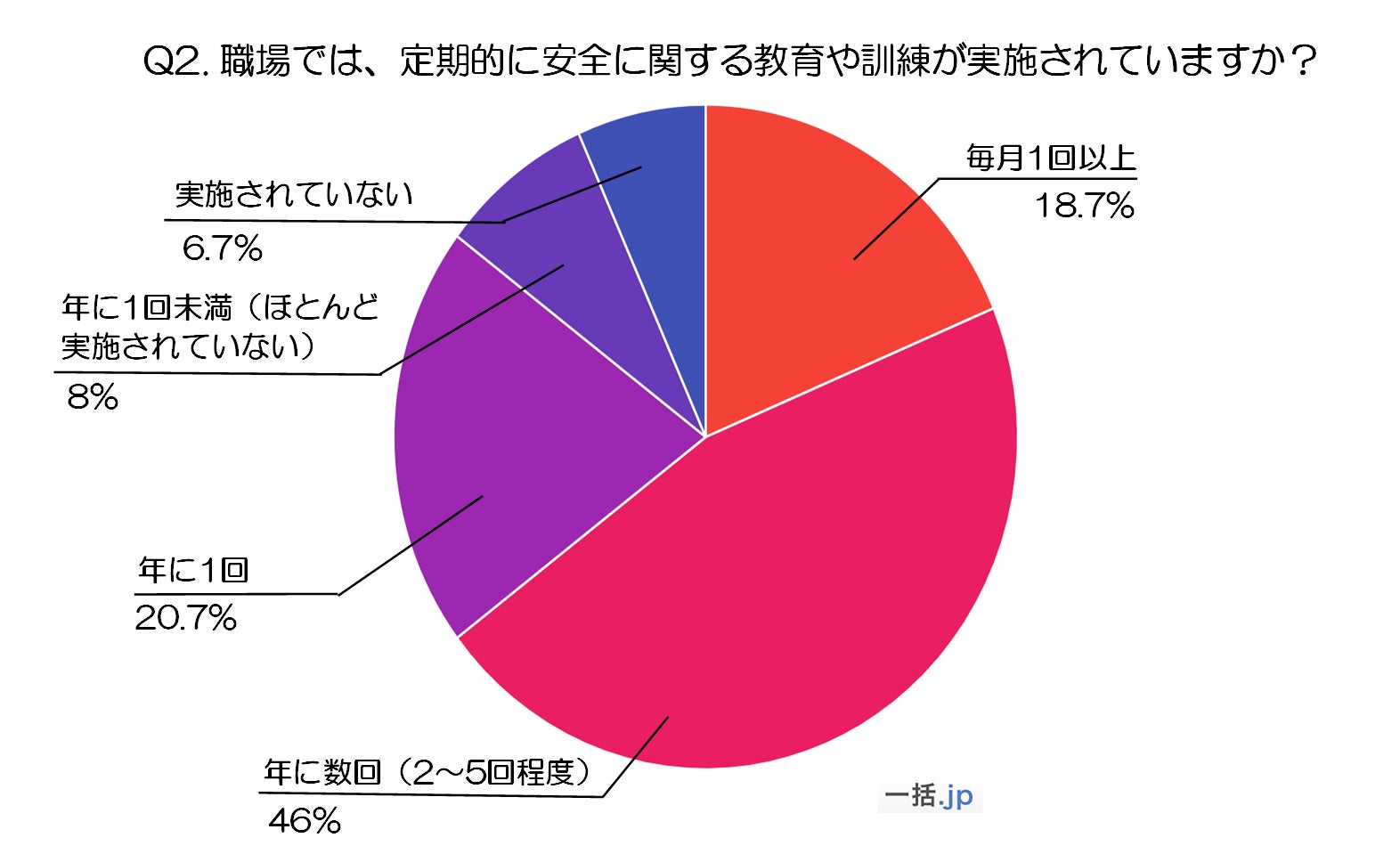 最も多かった回答は「年に数回(2~5回程度)」で、全体の46%を占めています。これは、多くの職場で安全に関する教育や訓練が年に複数回実施されていることを示していますが、月に1回以上の頻度で実施している職場は18.7%にとどまっています。さらに、「年に1回」の頻度で行われているという回答も20.7%あり、頻度の低さが見受けられます。