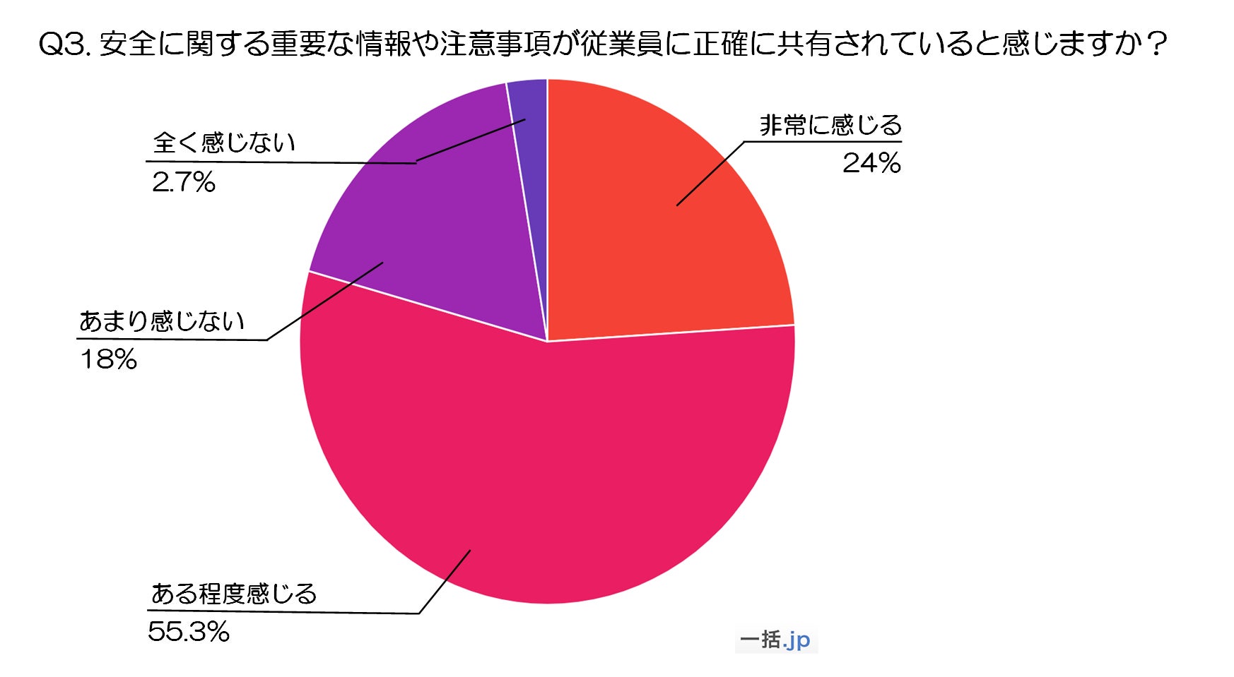 最も多かった回答は「ある程度感じる」で、全体の55.3%を占めています。この結果から、多くの従業員が安全に関する重要な情報や注意事項がある程度共有されていると感じていることがわかりますが、「非常に感じる」と答えたのは24%にとどまっており、完全な共有には至っていないことが示唆されます。