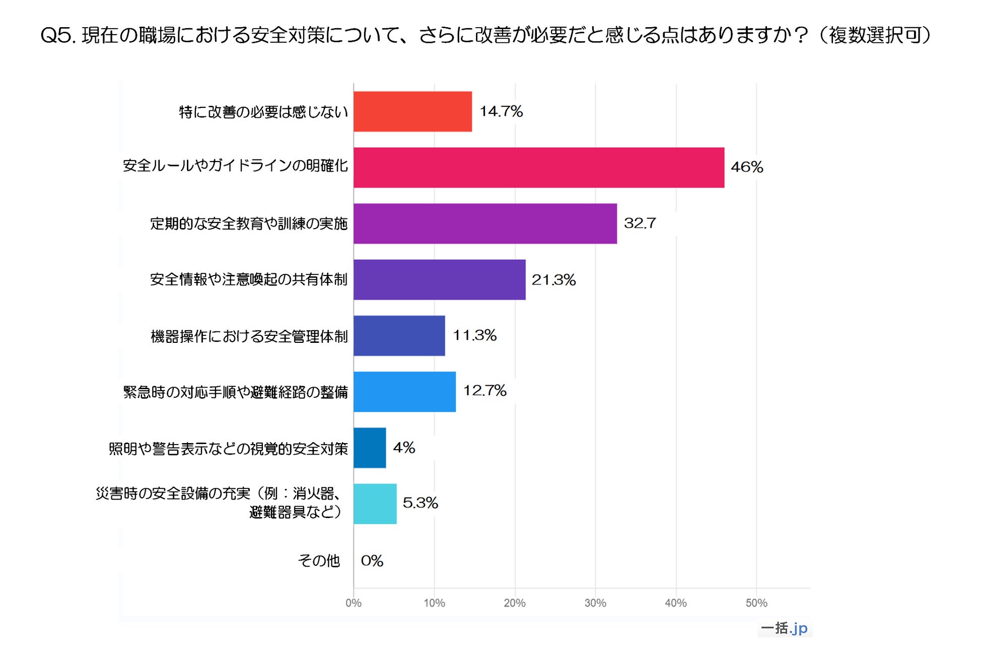 一方で、「特に改善の必要は感じない」と回答した人も14.7%おり、現状の安全対策に満足している層も存在します。全体的には、安全ルールの明確化と定期的な訓練の充実が優先的に求められていることが明らかになりました。