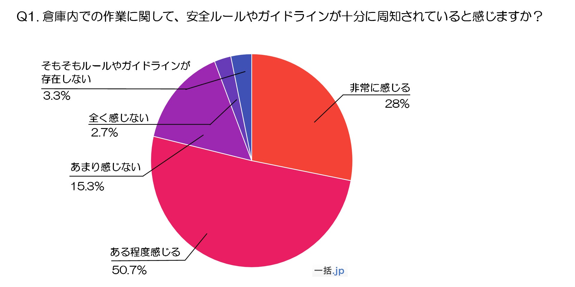 最も多かった回答は「ある程度感じる」で、全体の50.7%を占めています。この結果から、多くの作業者が倉庫内の安全ルールやガイドラインをある程度認識していることがわかりますが、一方で「非常に感じる」と答えた人は28%にとどまっており、完全な周知には至っていないことが伺えます。