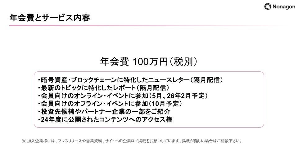 Web3スタートアップや関連企業との協業や提携を模索するコミュニティメンバー企業に対し、Nonagon Capitalがこれまでに世界中で構築したWeb3業界のネットワークから、協業先や投資先の一部をご紹介しております。どのような企業と、どのような形で連携したいのかなどをヒアリングさせていただいた上で、当該企業を紹介しております。
