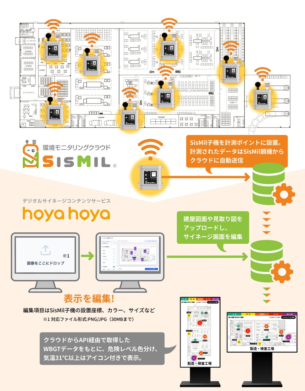 計測した暑さ指数データを「建屋図面や見取り図上に」可視化できる「プロット版 熱中対策情報 with SisMil」をリリースいたしました。 どこがどれくらい暑いのかを直感的に共有できるサイネージコンテンツです。