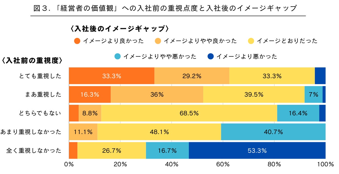 さらに、入社前に経営者の価値観をどれだけ重視していたかによって、入社後の印象にも大きな差が生まれることが分かりました。