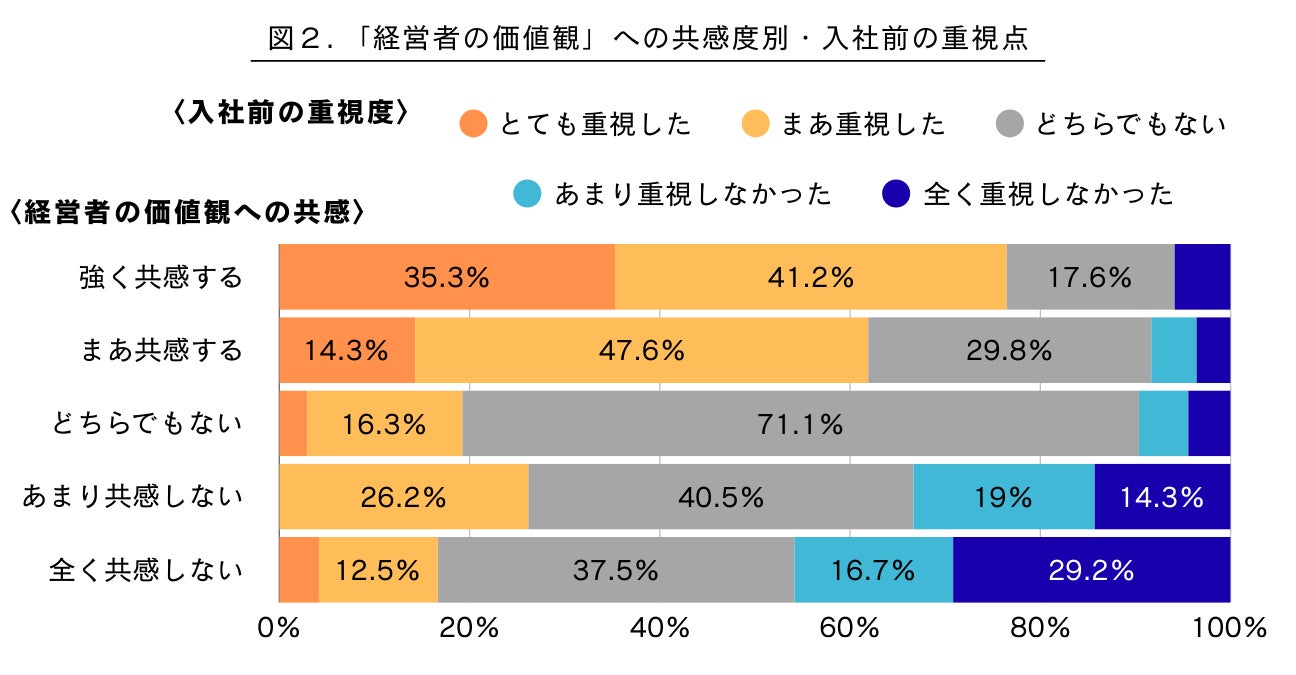 調査の結果、経営者の価値観に強く共感している社員ほど、就職活動時から「経営者の価値観」を重視して会社選びをしていたことが分かりました。