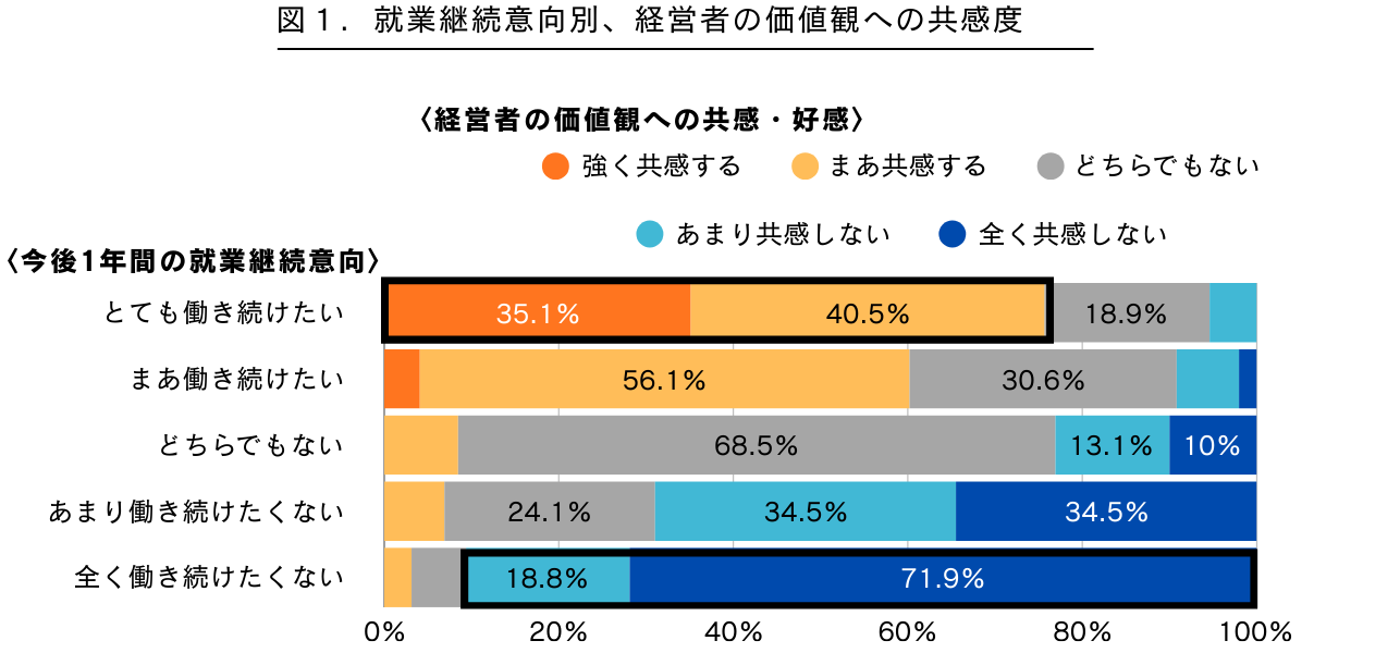 「今後1年間の就業継続意向」と「経営者の価値観への共感・好感」について調査を行いました。