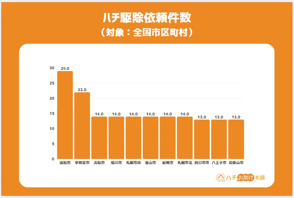 全国を対象に駆除依頼件数の多い市区町村を集計した結果は浜松市が26件で最多。