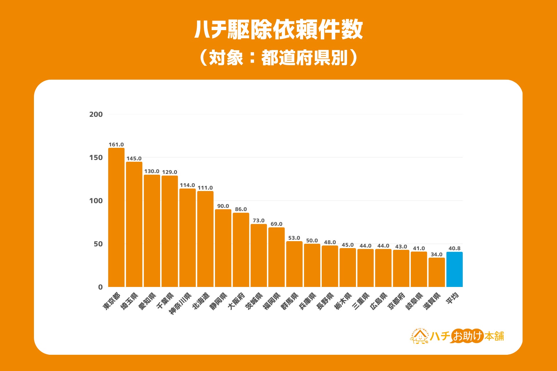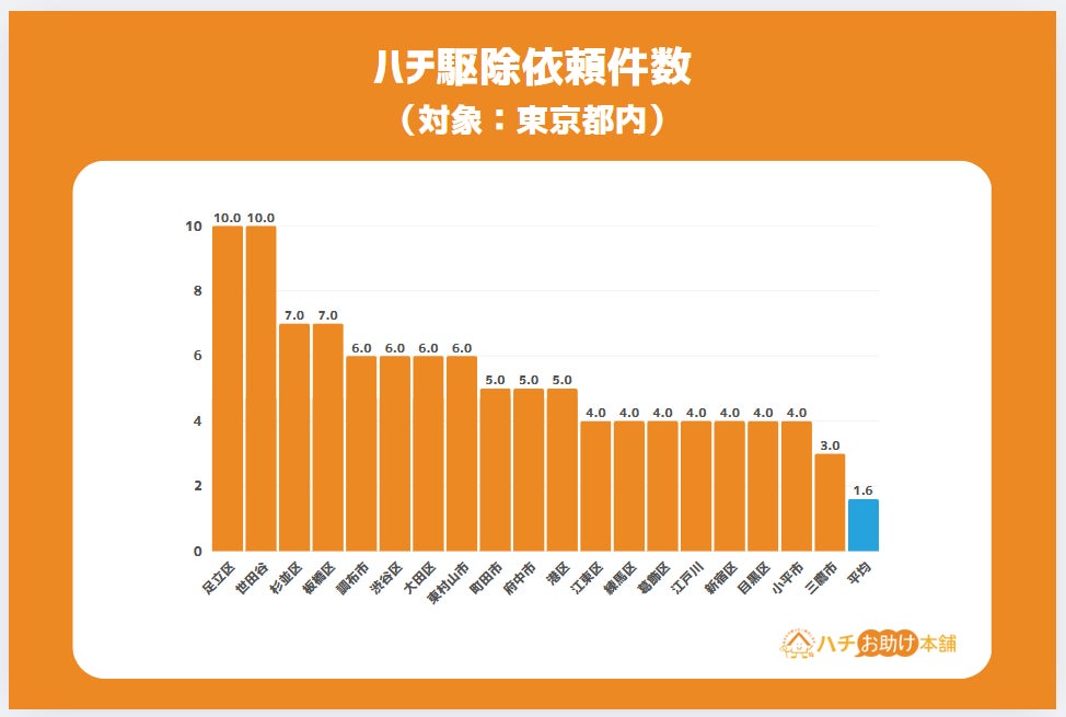 東京都は最も人口が多く、その分依頼総件数が増えるのは当然といえるものの、都心部に近ければ近いほどハチ被害からは縁遠い感覚を持たれる方も多いと思います。実情は、渋谷区など東京の中心に位置する区からの駆除依頼もあり、どこに住んでいてもハチ被害に遭う可能性があることを知っておくことが大切です。