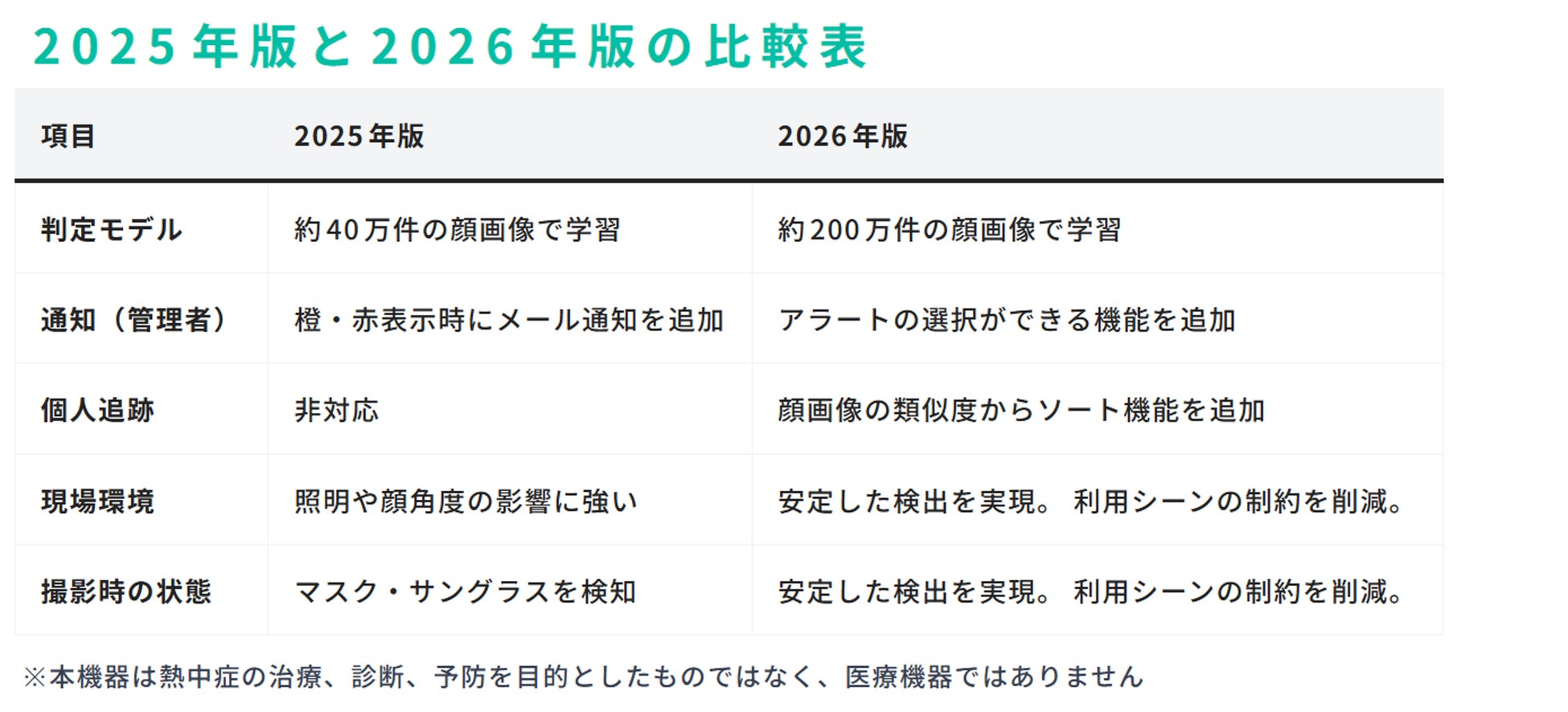 本アップデートでは、暑熱リスク判定精度の向上に加え、撮影環境による照明ムラ(部分的な明暗差)や、マスク・サングラス等による顔の遮蔽の影響を受けにくい、頑健な検出性能を実現しました。さらに、個人顔画像のソート機能など、運用面における多岐にわたる機能改善を行っています。