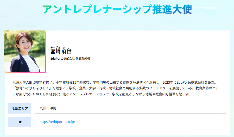 EduPorte株式会社(本社:福岡市、代表取締役:宮崎麻世)は、代表の宮崎がこのたび、文部科学省「アントレプレナーシップ推進大使」に任命されたことをお知らせいたします。