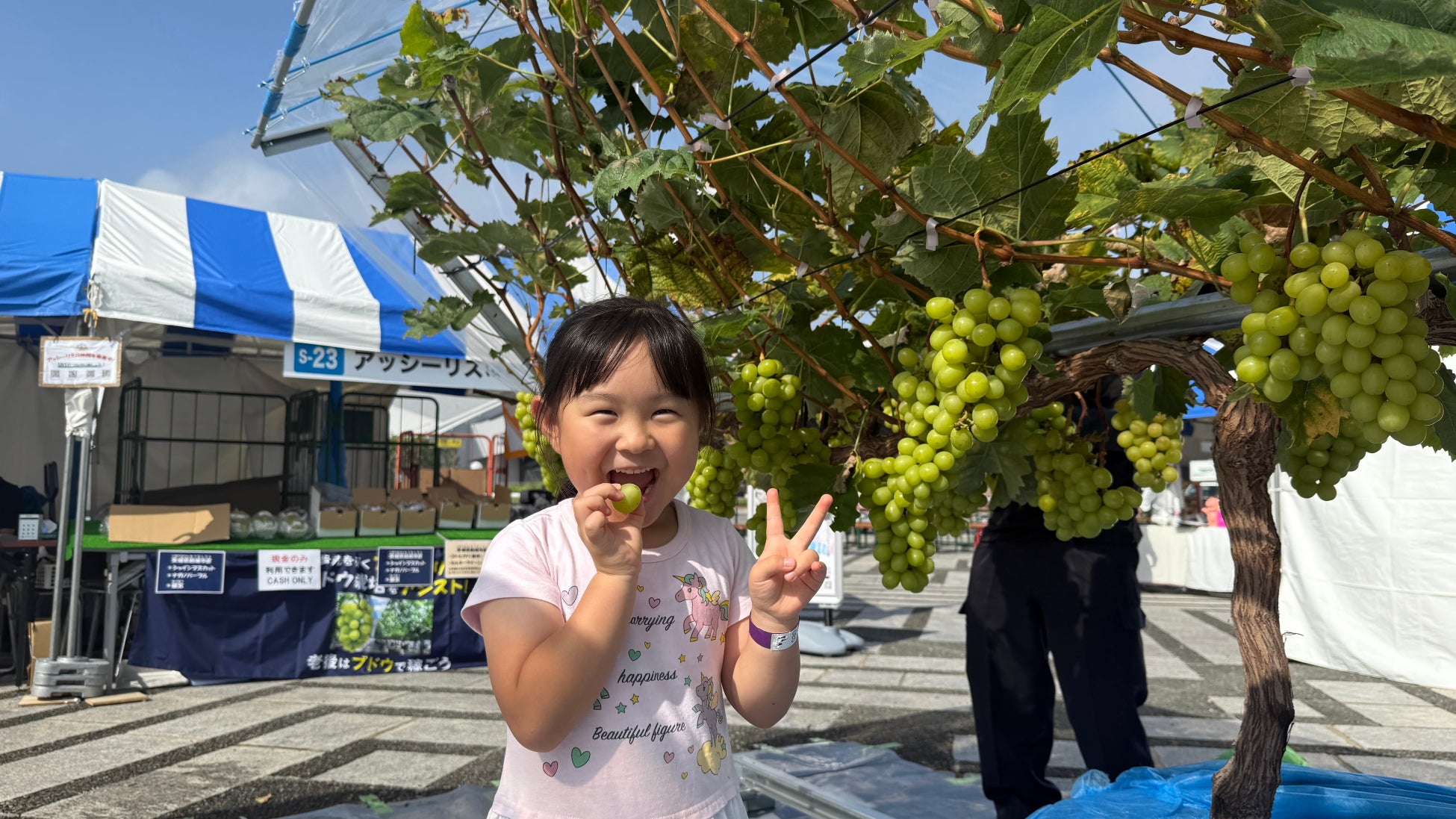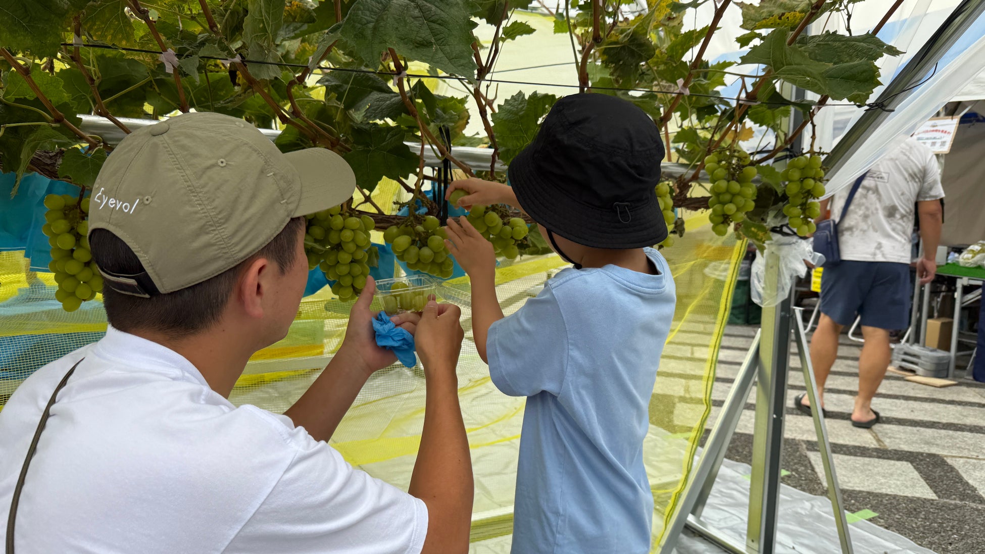イベント当日、会場にシャインマスカットなどが実った果樹棚が設置されると、多くの子どもたちが足を止め、子どもに人気の「ぶどう狩り」に参加しました。自分の手で蔓に触れ、果実を収穫するという「本物の体験」は、都会の子どもたちにとって新鮮な驚きがあったようです。