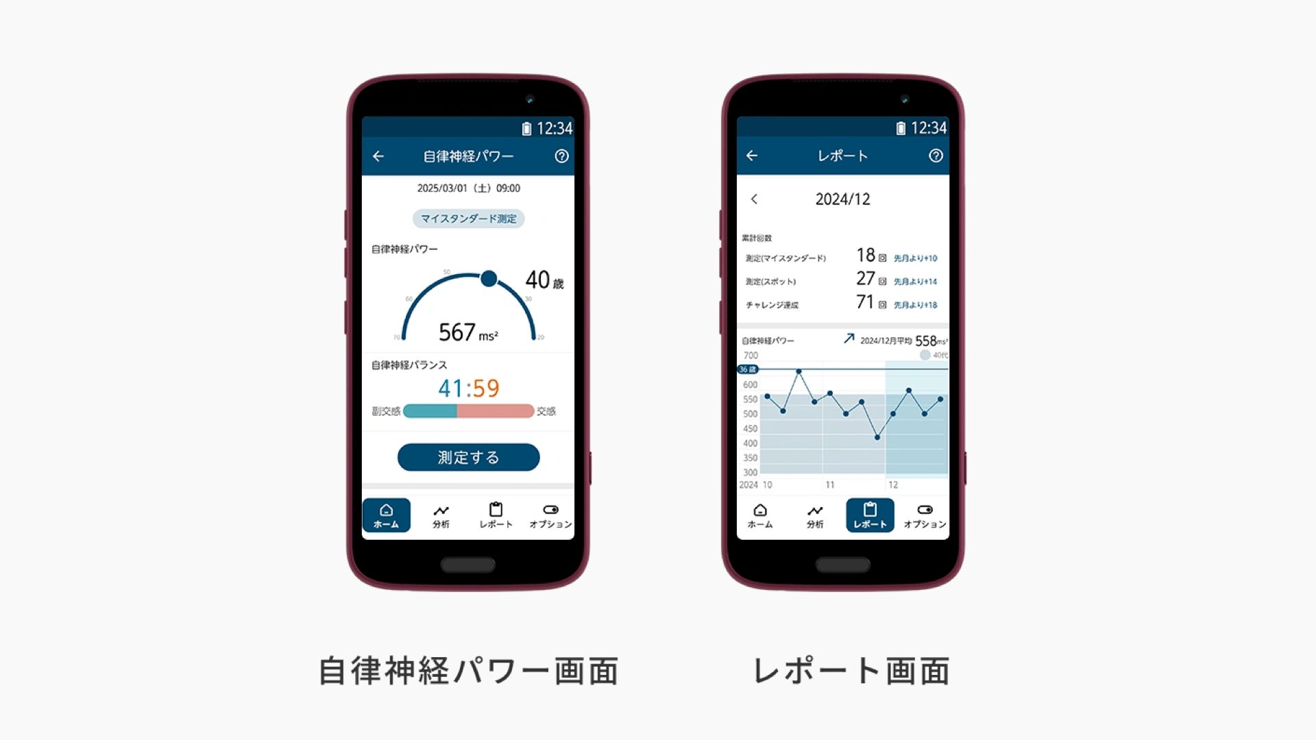 測定結果はレポート画面からいつでも見返すことができます。またアプリ内では自律神経を鍛える行動を紹介しており、森谷敏夫 京都大学名誉教授が長年の研究で培った、改善方法を通じた健康的な生活習慣の実践をサポートします。