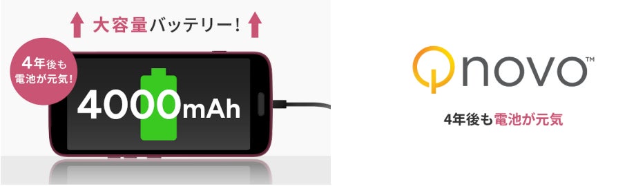 「らくらくスマートフォン F-53E」は、約10%容量アップ※3の4000mAhのバッテリーを搭載しています。また、Qnovo社と共同開発した独自技術※4により電池の劣化を抑え、4年後でも初期容量の80%を維持※5するため、長期間快適に使い続けることができます。