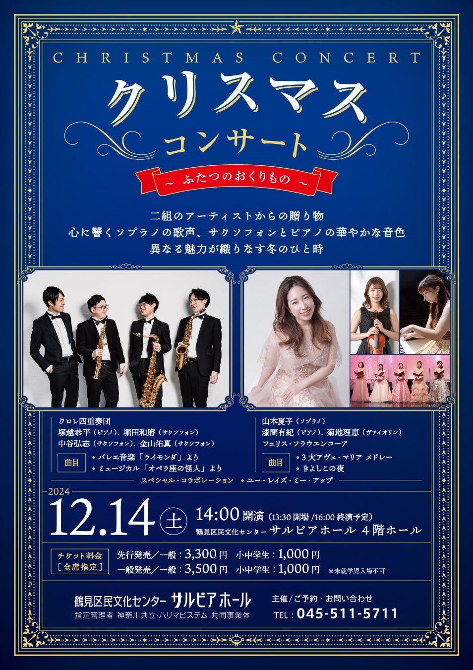 横浜市鶴見区民文化センター サルビアホール【クリスマスコンサート~ふたつのおくりもの~】を開催! 12月14日(土)「3大アヴェ・マリア メドレー」「きよしこの夜」「オペラ座の怪人」などお楽しみに!