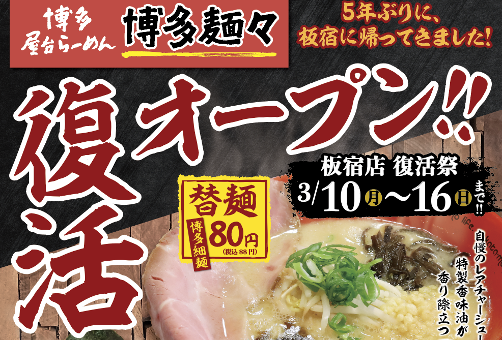 【博多麺々 板宿店】復活オープン!3/10(月)~3/16(日)復活祭!!期間中のご飲食でラーメン半額券プレゼント!!