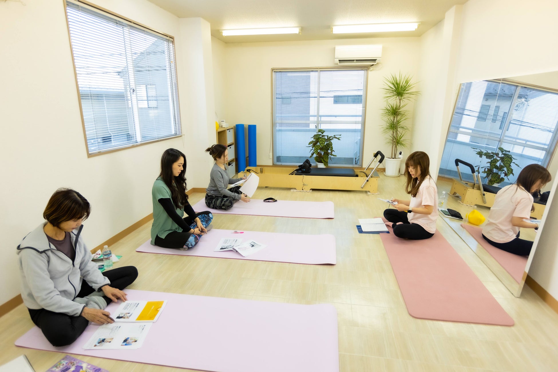 月に3〜4回、系列のパーソナルジムスタッフと合同研修を行い、ピラティスやヨガの技術向上に励んでいます。