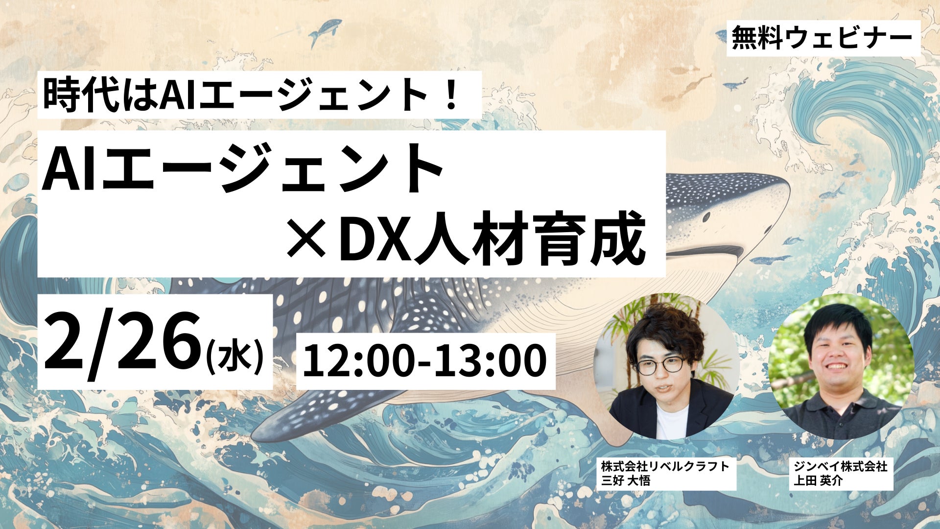 ジンベイ株式会社(本社:神奈川県横浜市、代表取締役:上田 英介、以下「ジンベイ」)は、株式会社リベルクラフト(本社:東京都中央区、代表取締役:三好 大悟、以下「リベルクラフト」)と、2025年2月26日(水)12時から、AIポータルメディアの株式会社アイスマイリー主催の「AIエージェント×DX人材育成」へ登壇することをお知らせいたします。