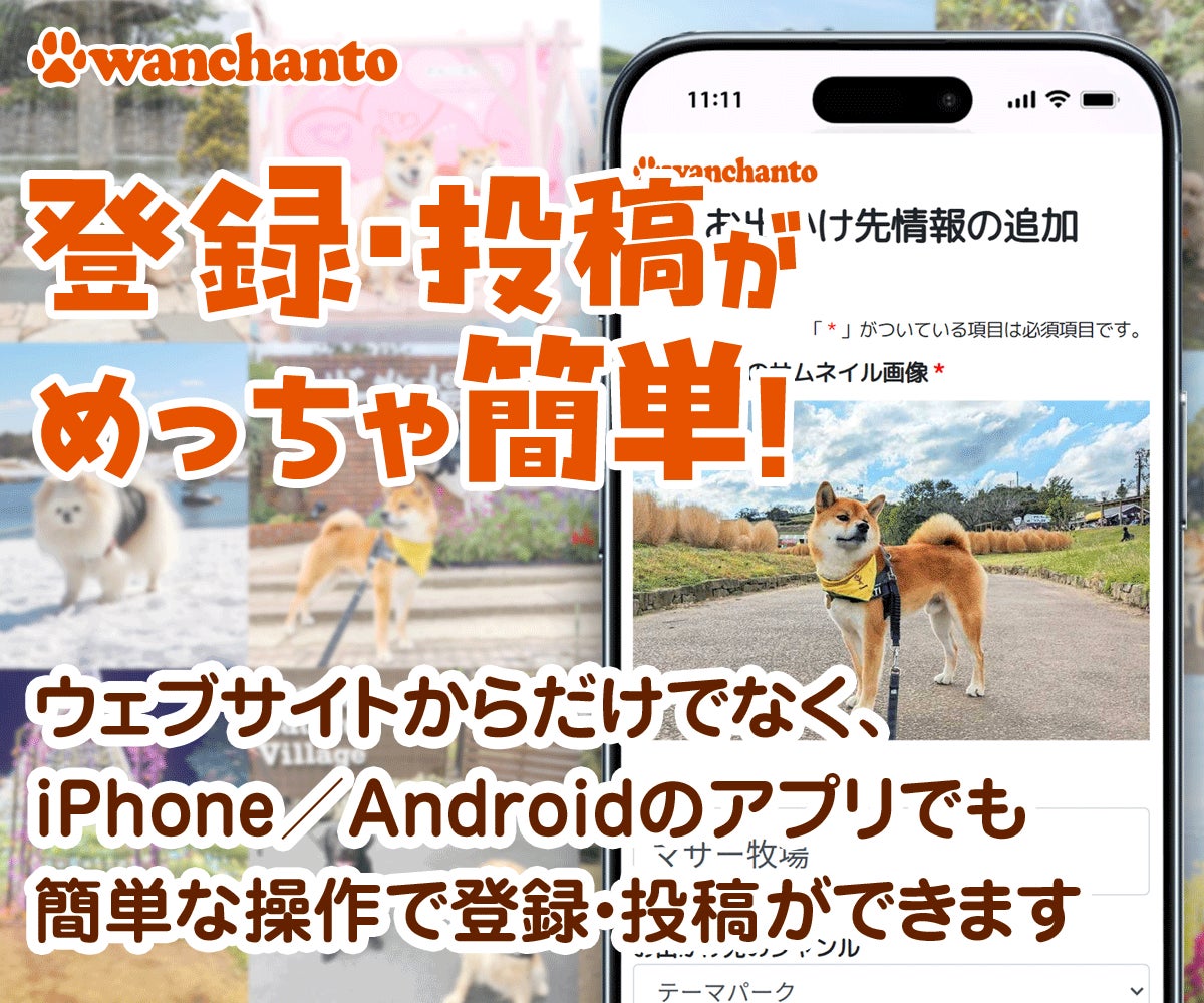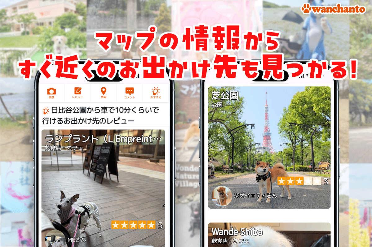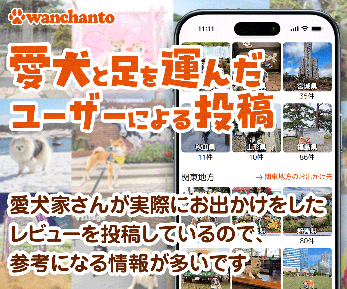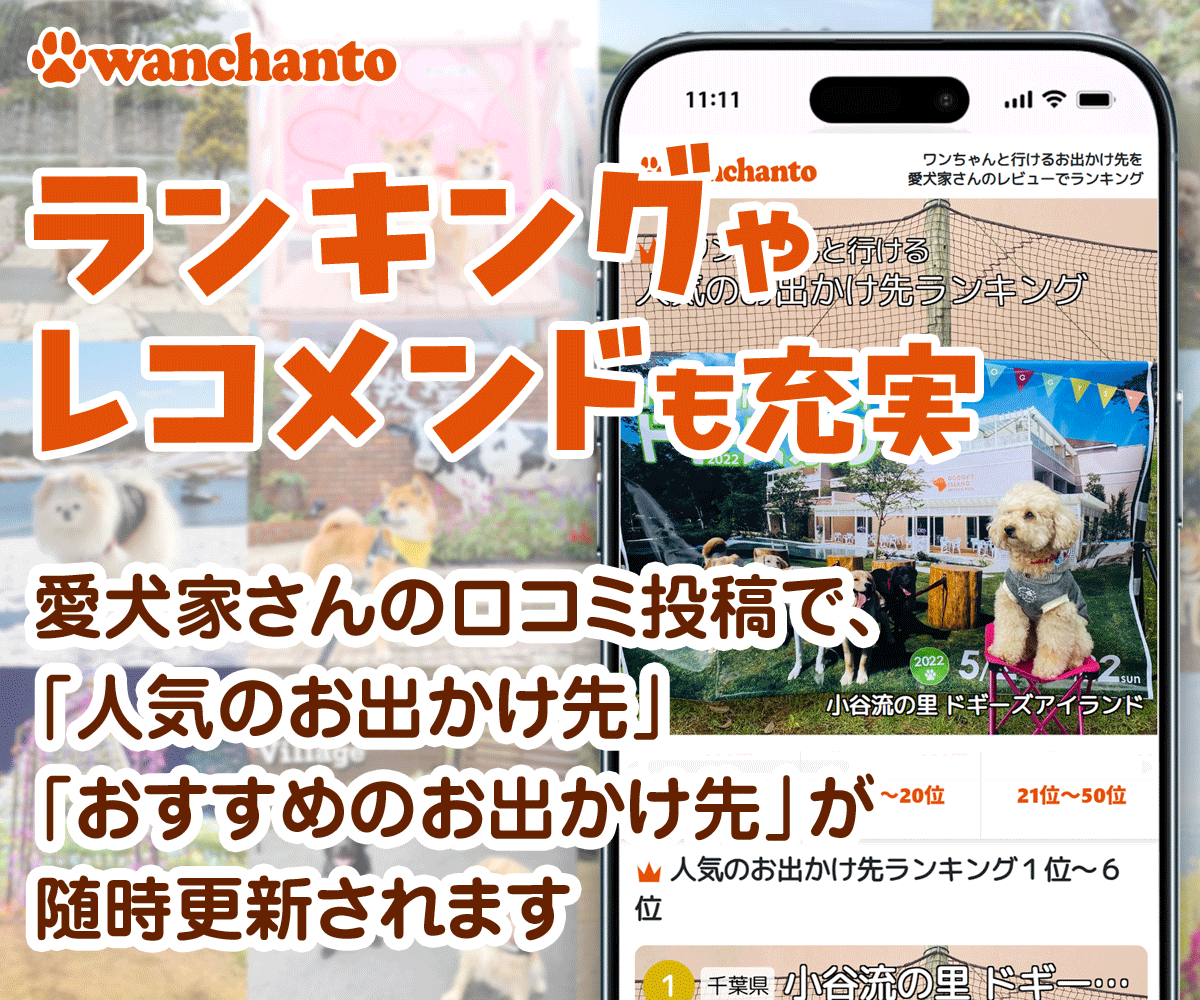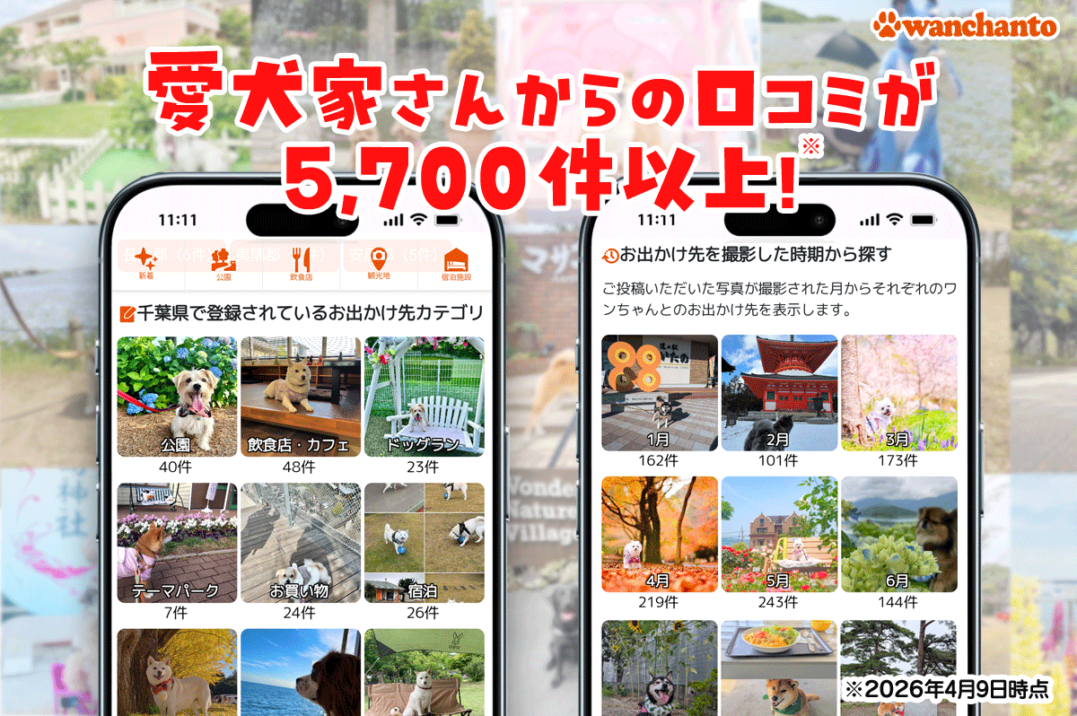 「ワンちゃんと」は、ユーザーの皆様が投稿した口コミで成り立っています。お出かけ先の口コミが増えるほどに、より多くの愛犬家さんとワンちゃんが幸せな時間を過ごせるようになります。ぜひ「ワンちゃんと」を愛犬との素敵な思い出の共有ツールとして使っていただけると幸いです。