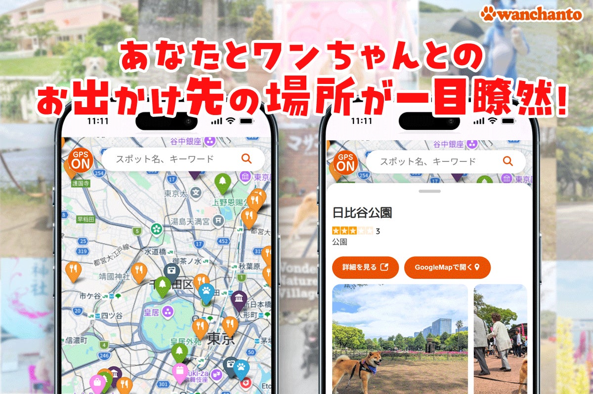 犬連れお出かけ情報サイト「ワンちゃんと」は、GPS機能を搭載した地図型検索ツール「ワンちゃんとマップ」を実装。5,700件以上のリアルな口コミを元に、現在地周辺の犬同伴スポットを瞬時に探せます。