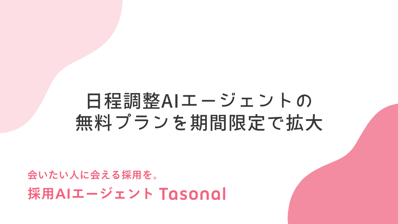 HR領域のAIサービスを提供する株式会社SAIRAI(本社:東京都新宿区、代表取締役CEO:平井瑞樹)は、AI採用プラットフォーム「Tasonal(タソナル)」において、日程調整AIエージェントのβ版無料トライアルを拡張し、"無料プランの月間調整件数を通常の月5件から月30件へ引き上げ"、3ヶ月間ご利用いただけるキャンペーンを開始したことをお知らせいたします。