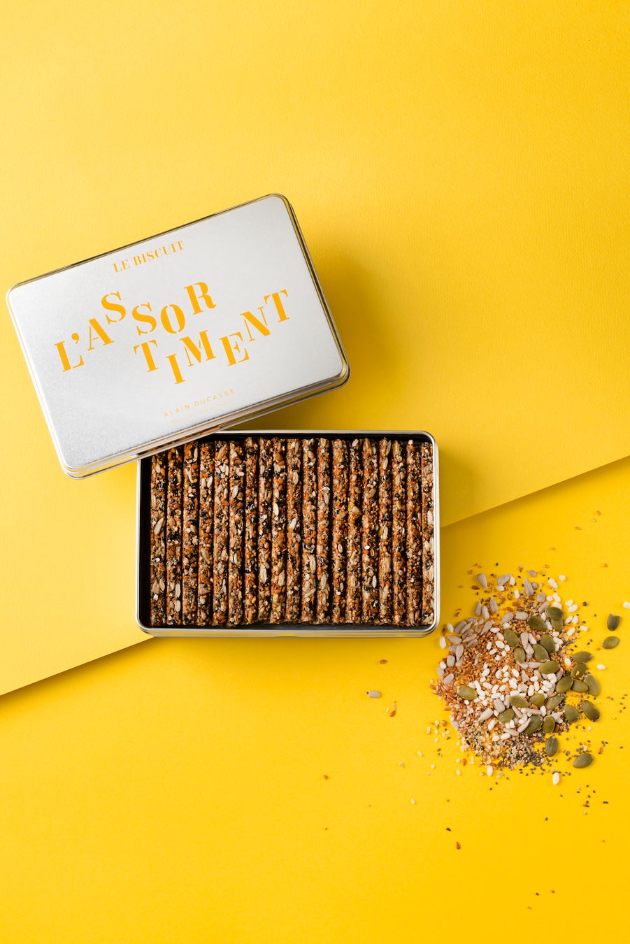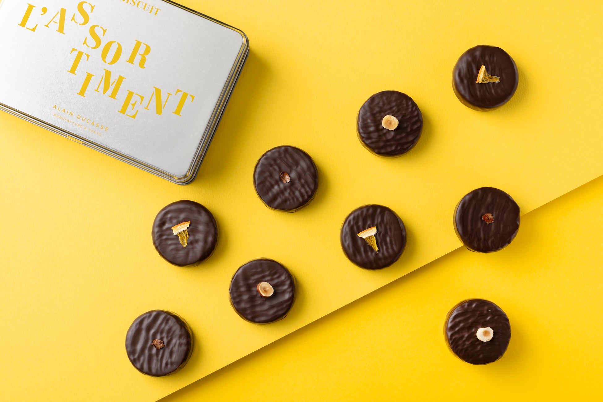「ル・ビスキュイ・アラン・デュカス」のビスケットは、味の職⼈アラン・デュカスが描く美味しさを 追求した“ビスキュイ・キュイジネ(=料理仕⽴てのビスケット)”です。それは、常に妥協のない素材選 びと熟練の職⼈技、そして素材の特徴を最⼤限に活かした緻密なレシピという料理⼈のアプローチで仕 ⽴てられ、複雑に重なる⾷感に究極の味わいが広がるビスケットです。「ル・ショコラ・アラン・デュ カス」の⼯房で仕⽴てる⾃家製のショコラ、ガナッシュ、プラリネなどを素材として使⽤できるのもブ ランドならではの特徴です。