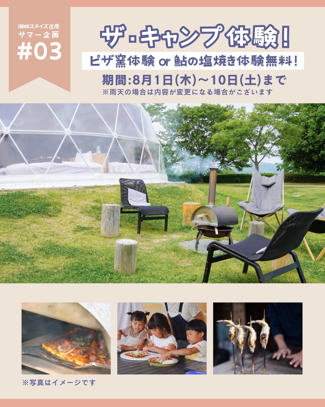■第3弾 8月1日(木)~11日(日)①【ザ・キャンプ体験!ピザ窯体験、OR 鮎の塩釜体験】