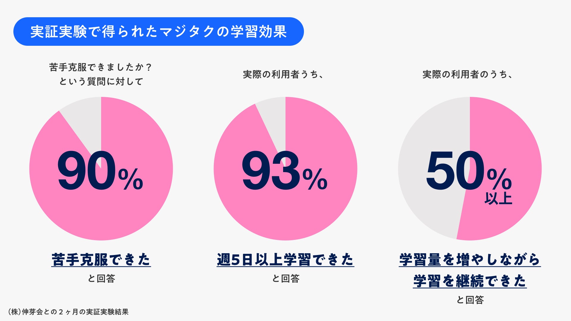 伸芽会との共同実証実験(2ヶ月間・20世帯参加)では、90%の家庭が「苦手が克服できた」と実感。 93%が「学習が週5日以上できた」と回答。50%以上が「学習量を増やしながら継続できた」という結果が得られ、短時間でも継続的な学習による効果が確認されています。