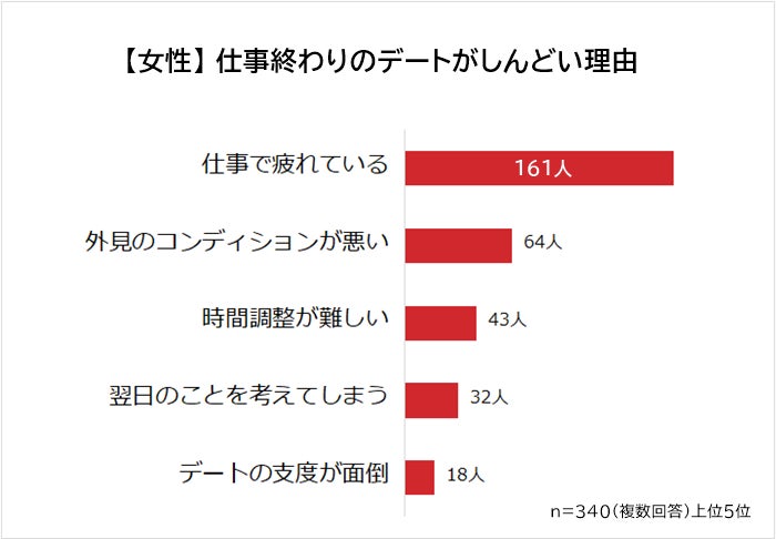20代~40代の社会人女性340人に「仕事終わりのデートがしんどい理由」を聞いたところ、圧倒的1位は「仕事で疲れている(161人)」、2位は「外見のコンディションが悪い(82人)」でした。